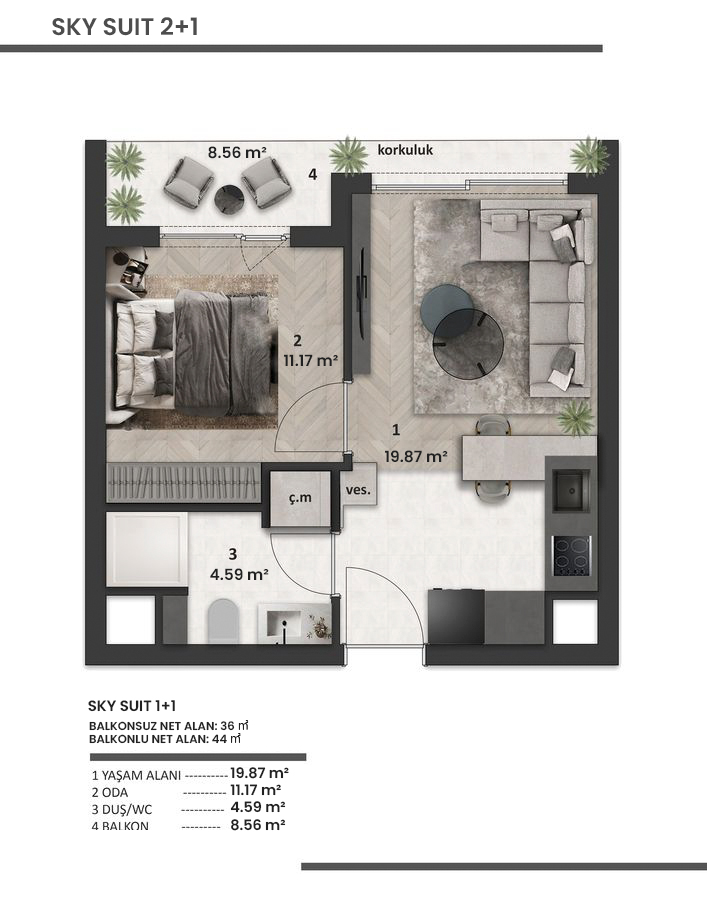 Toplam Net Alan: 44㎡
