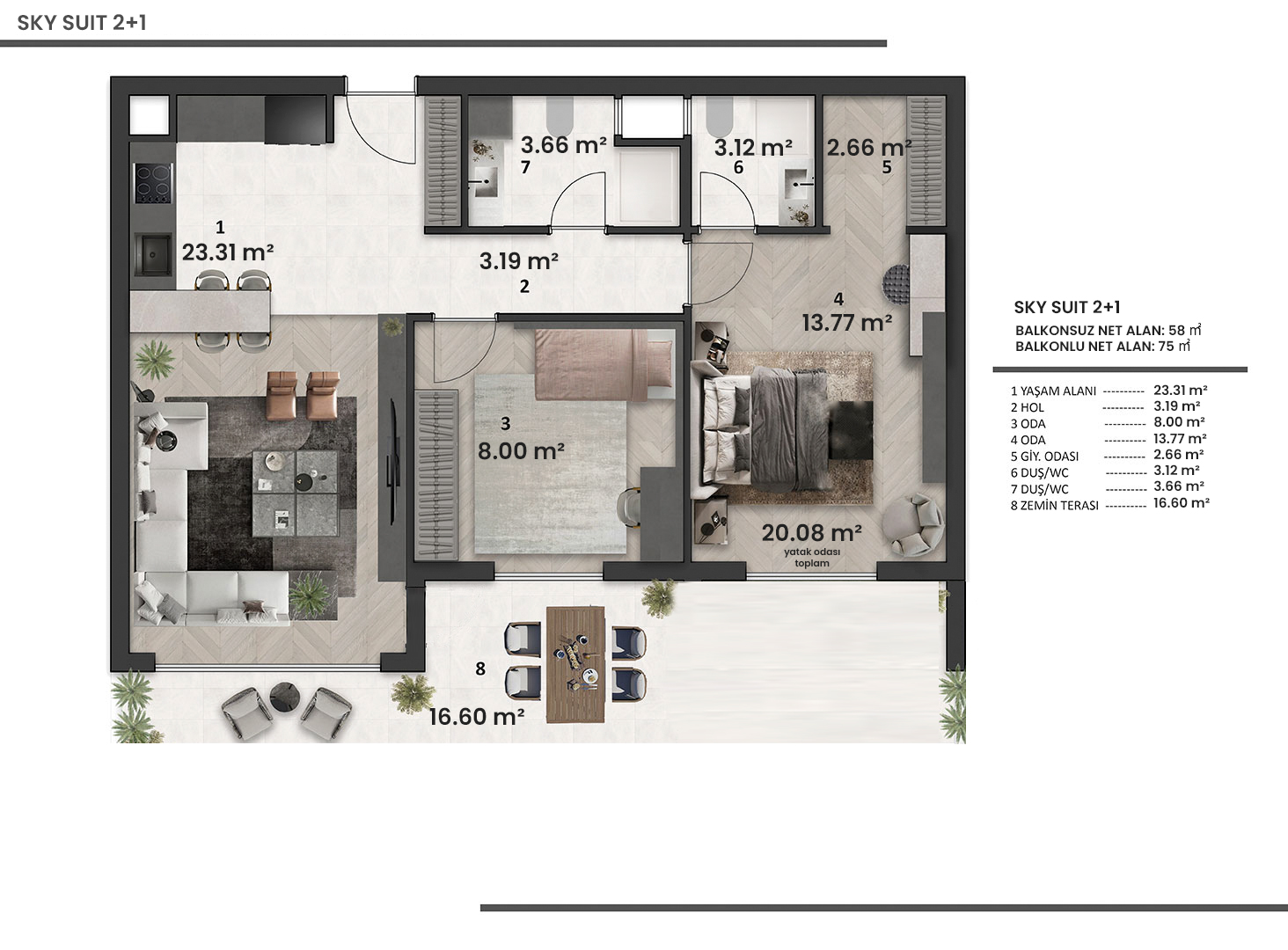 Toplam Net Alan: 75㎡